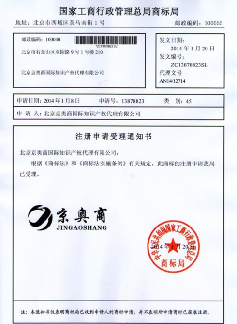 國內商標受理通知書(shū)樣本