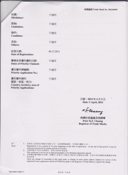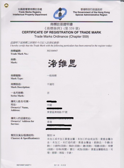 香港商標注冊證樣本